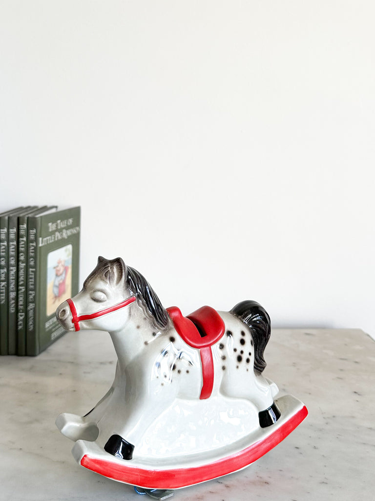 Vintage German ceramic rocking horse piggy bank or money box with key