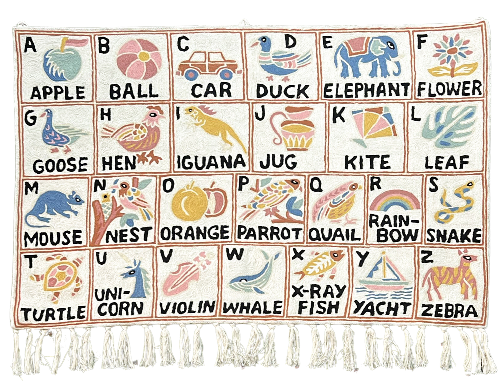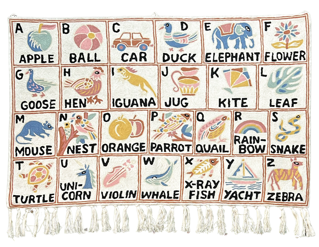 Handmade alphabet ABC crewel wall hanging tapestry | Aru (portrait) | PREORDER - 60 x 90cm (portrait) is preordered and will ship as soon as it is back in stock.