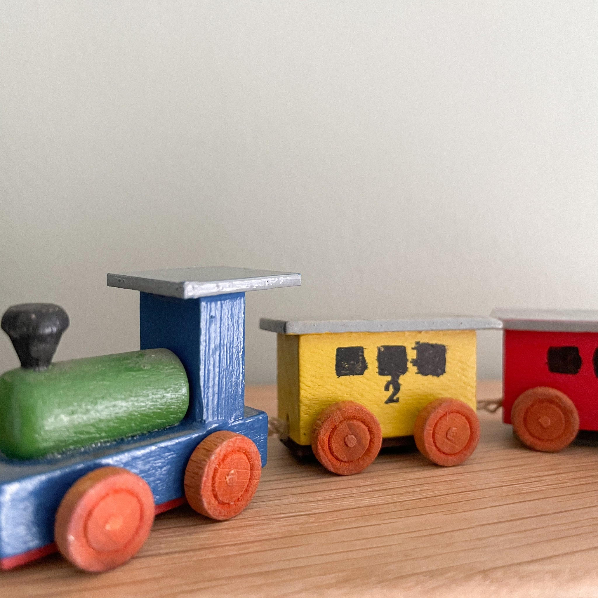 An incredibly sweet little wooden train made in the German Democratic Republic and hand painted in blue, yellow, red and green. Will squeeze happily in front of some books on a shelf for a little pop of colour and texture.