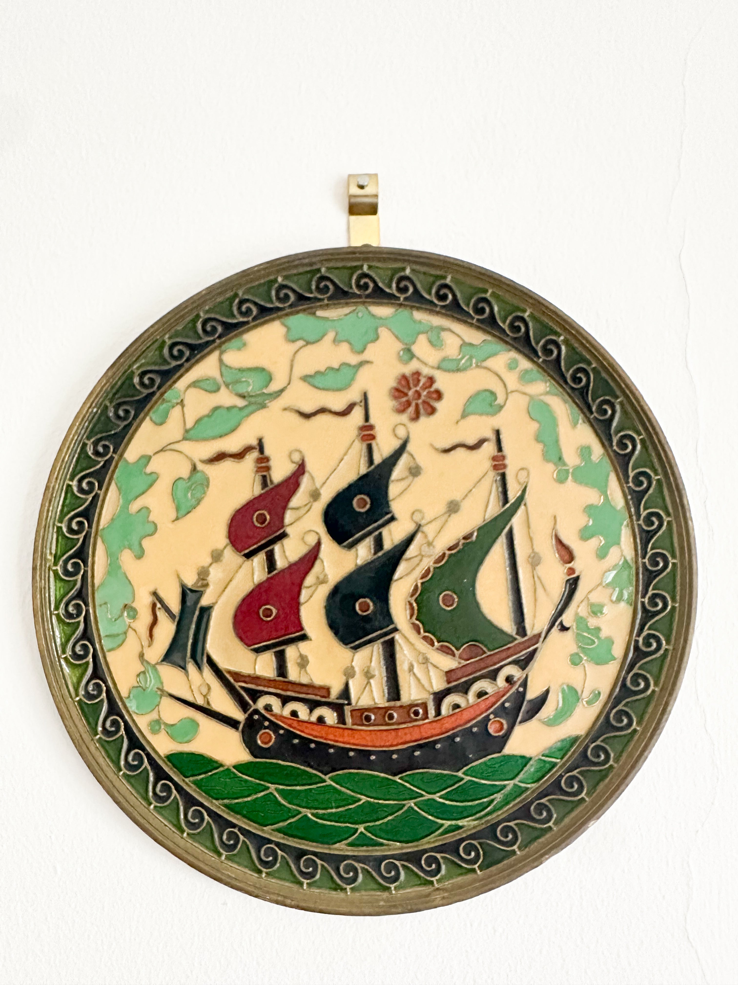 A super vintage brass enamelled plate featuring a ship. Looks lovely propped on a little shelf or would look fabulous hung alone or as part of a gallery wall.