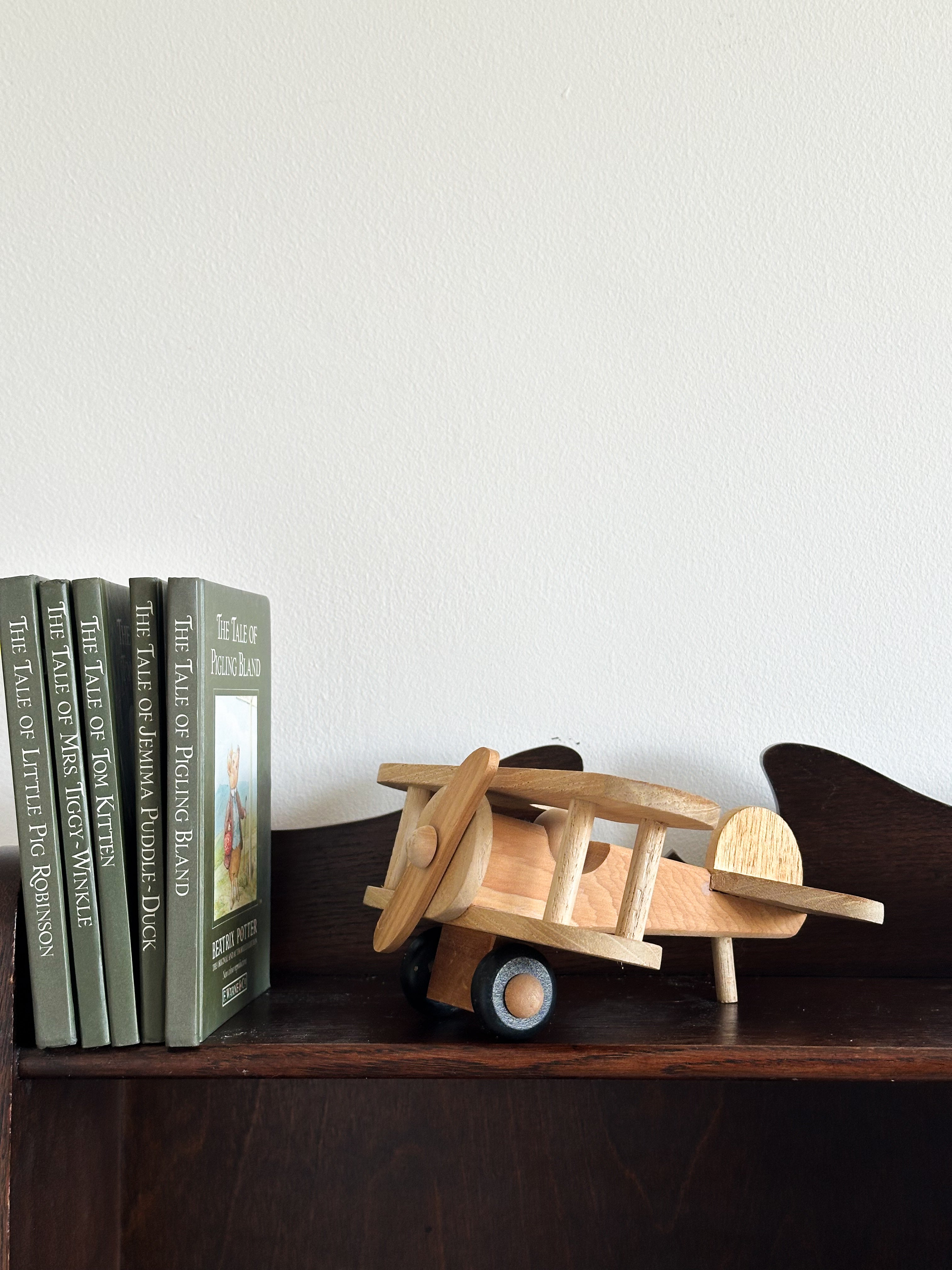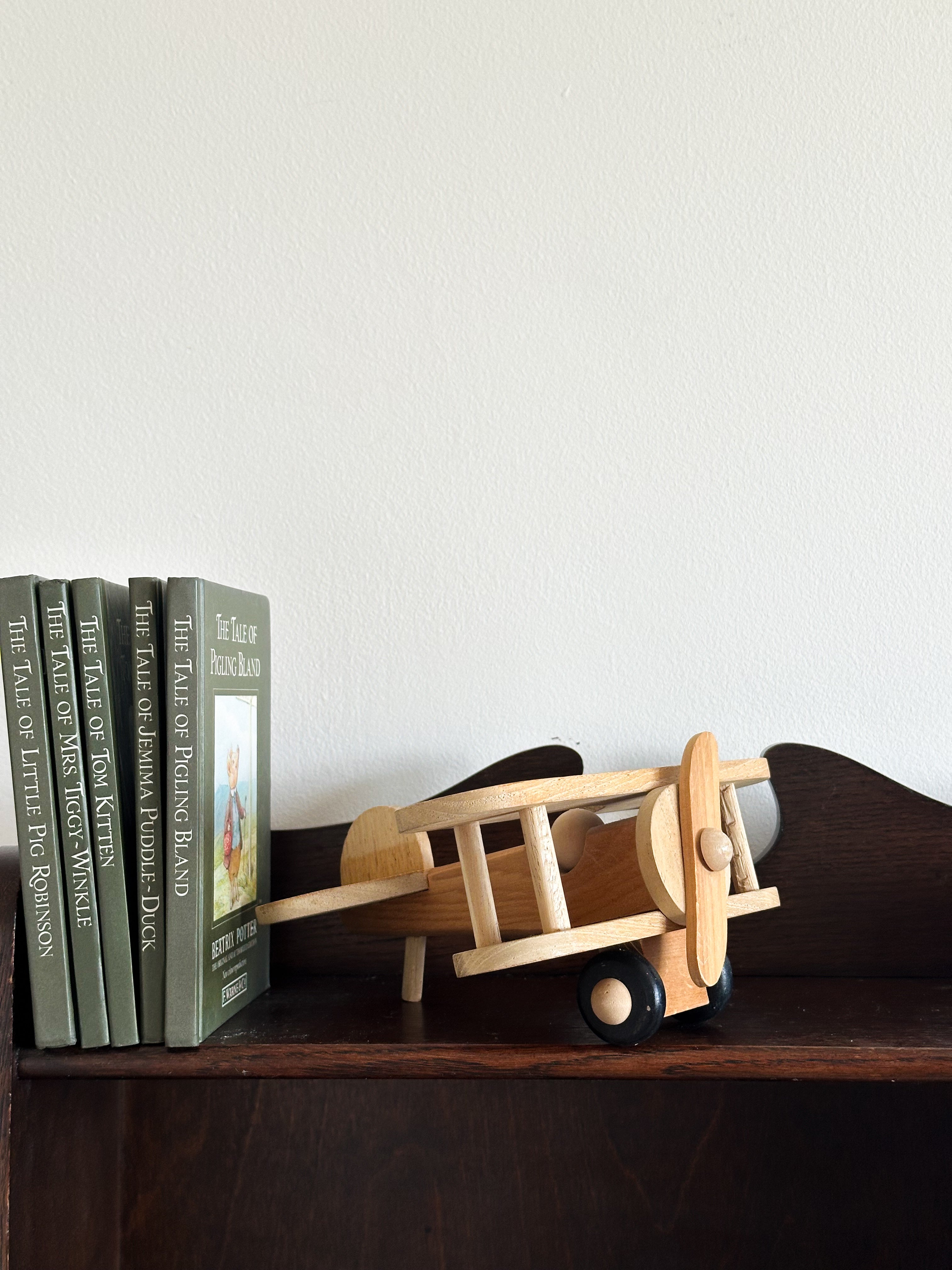 A brilliant vintage handmade wooden classic bi-plane aeroplane. All parts in beautiful condition. A charming addition to a special little shelf.
