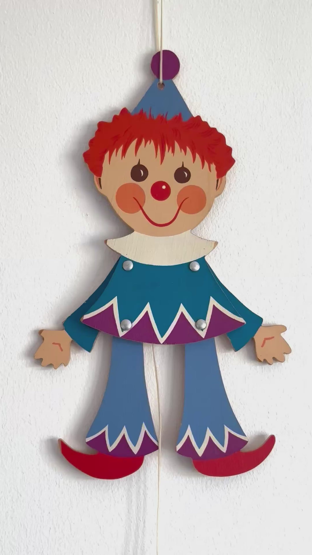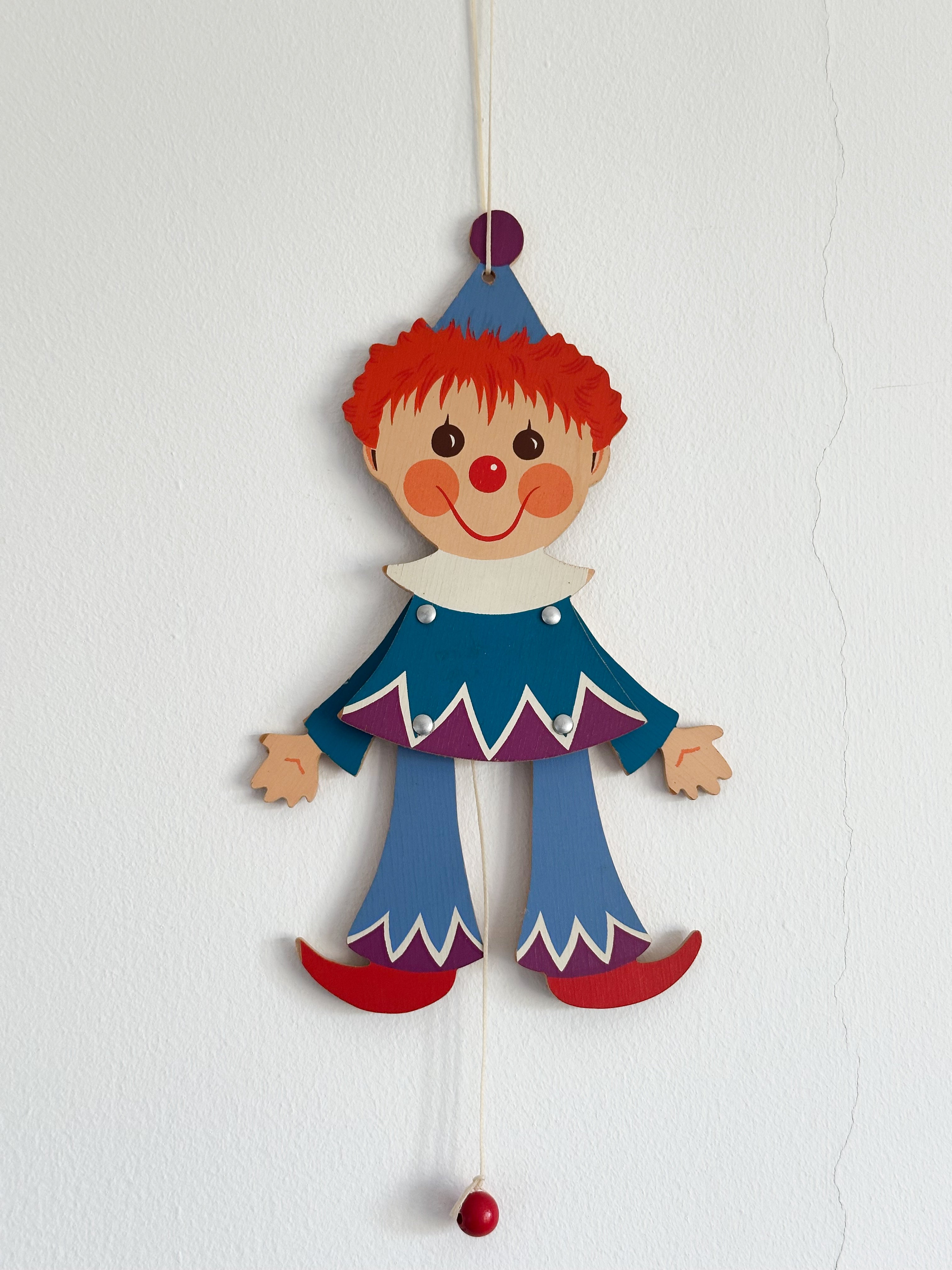 Vintage wooden 1960s German jumping-jack Clown pull toy by Mertens Kunst.