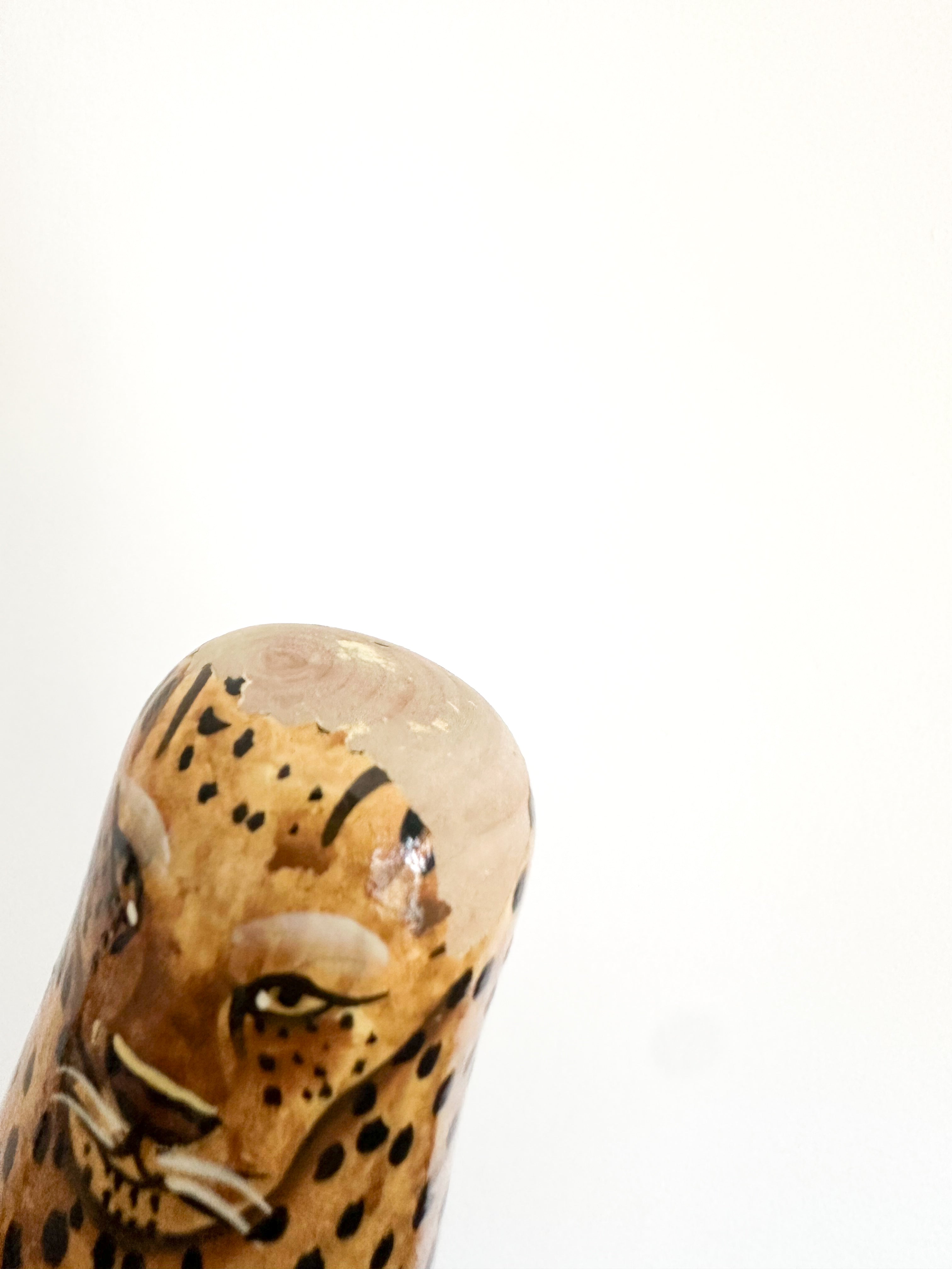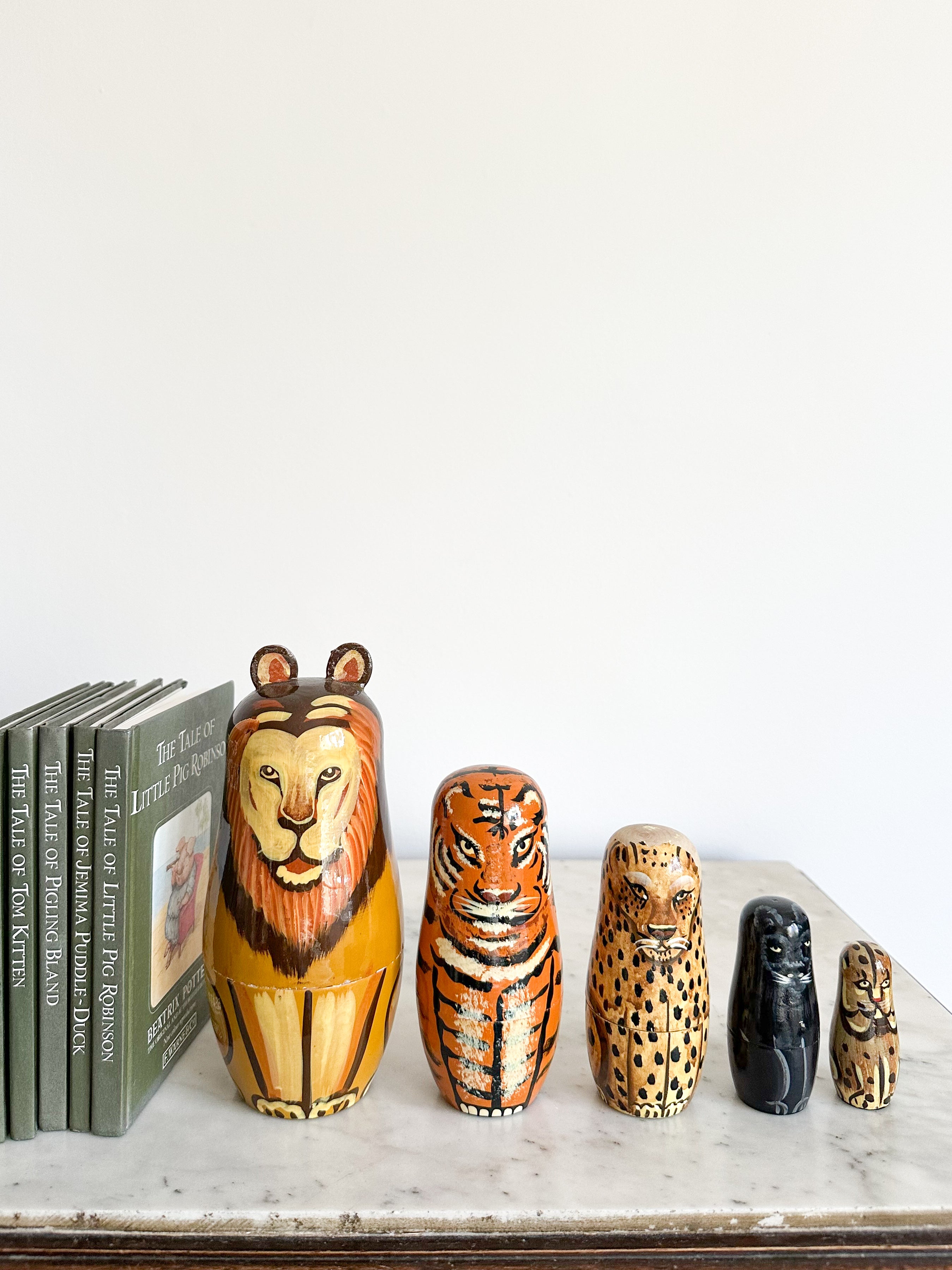 A super set of unusual vintage wooden big cat nesting dolls: lion, tiger, leopard, puma/panther, cheetah. Perfect little shelf companions.