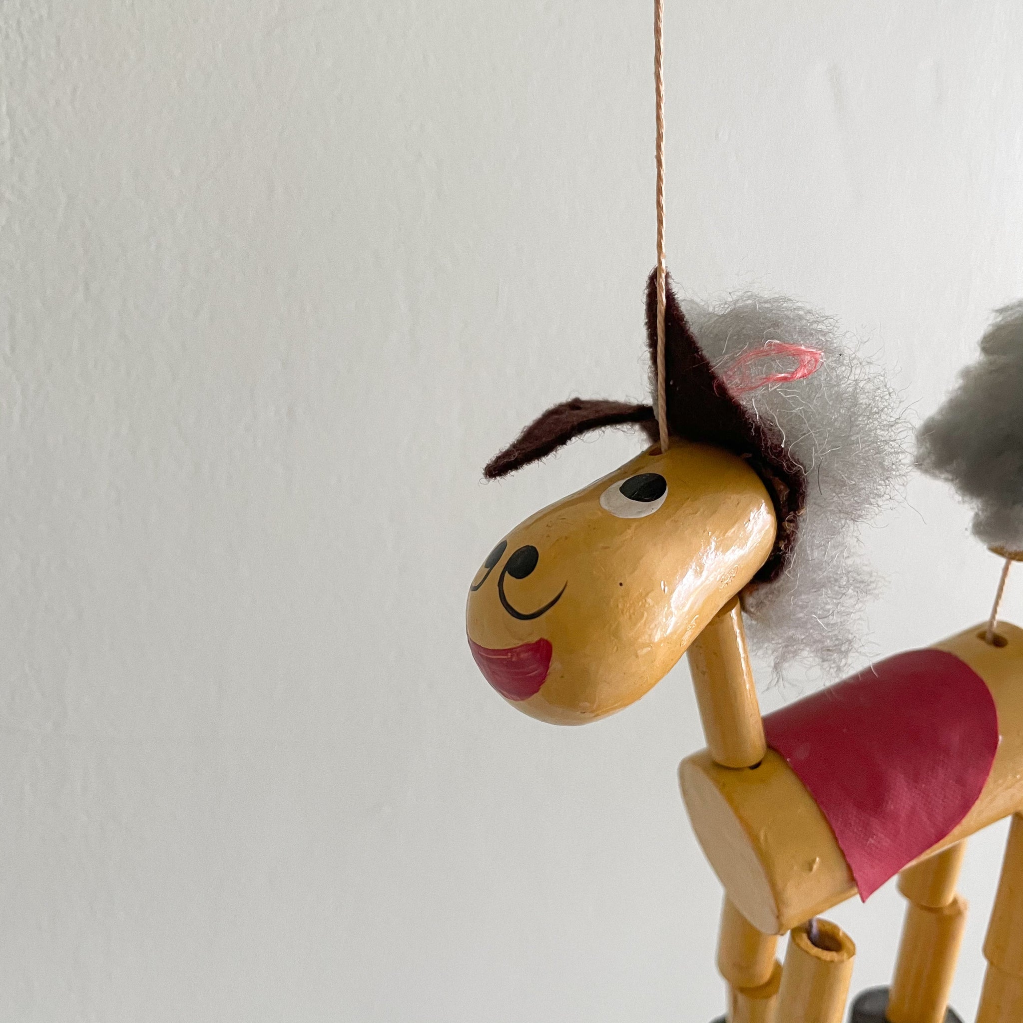 Very charming vintage wooden horse string puppet. Swipe to see a video of him in action. Would happily adorn a peg rail.